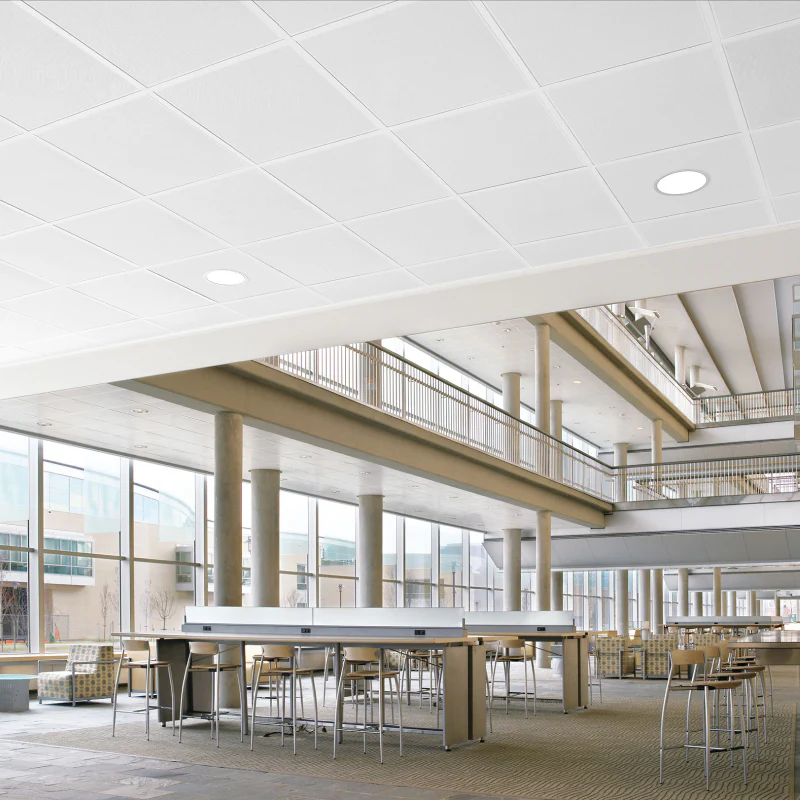 Smooth and sleek METALWORKS Tegular 24" x 24" ceiling tiles are cleanable, disinfectable, and can improve acoustics with a combo of perforated options and infill panels.